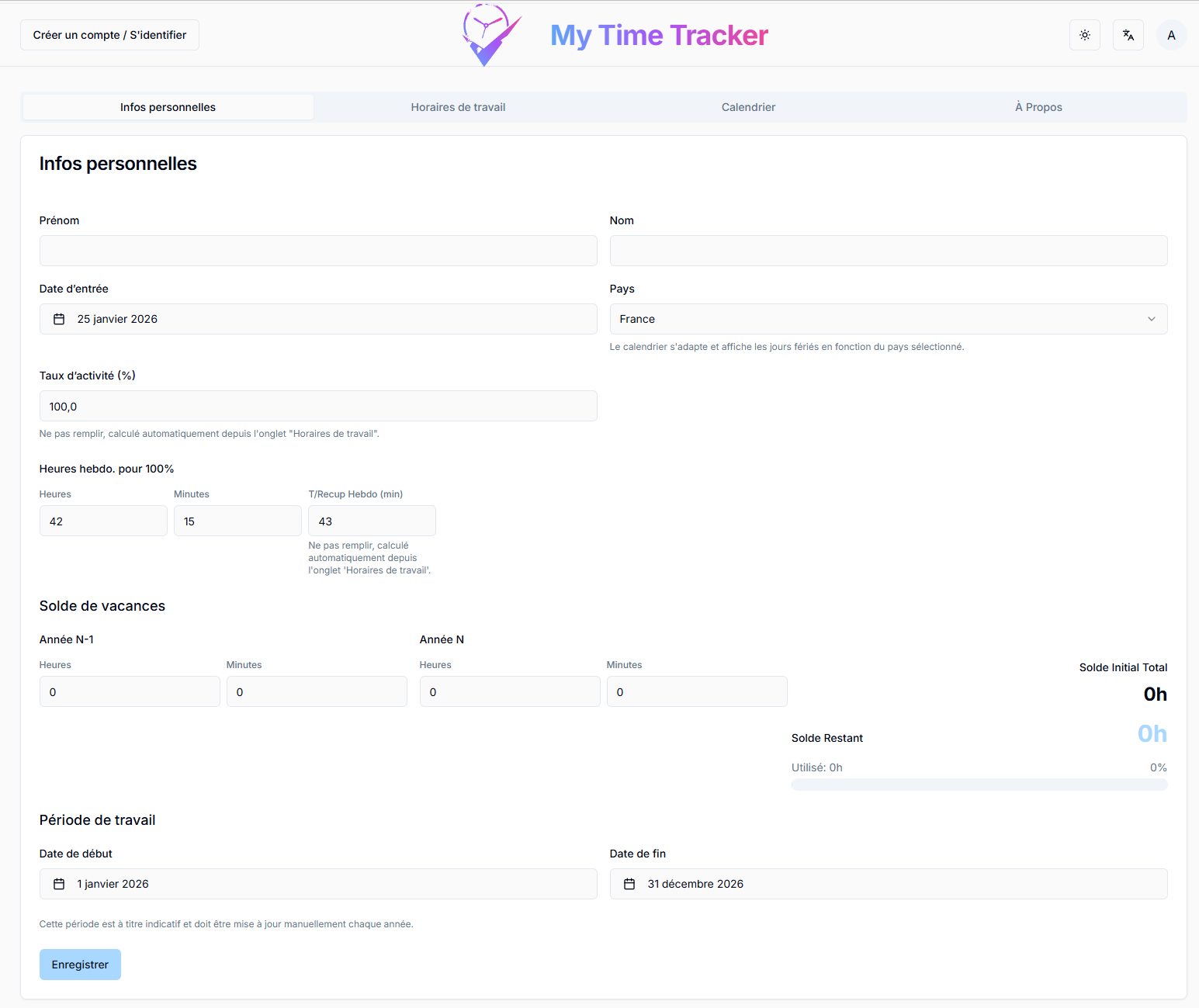- Tableau de bord personnalisé : Entrez vos informations personnelles, votre taux d'activité et vos soldes de vacances pour un suivi sur mesure.
