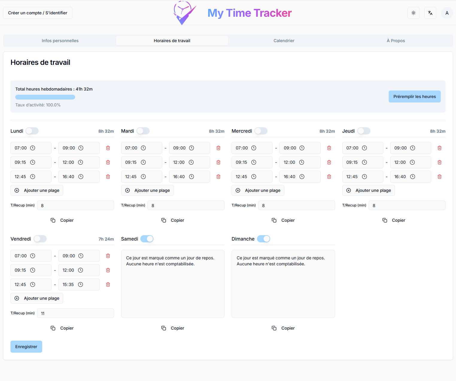 - Planification d'horaires : Définissez vos horaires de travail hebdomadaires, ajoutez des plages horaires et calculez automatiquement votre temps de travail effectif.