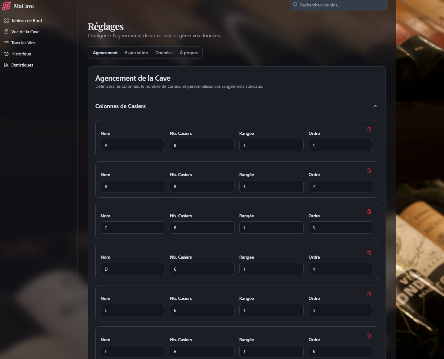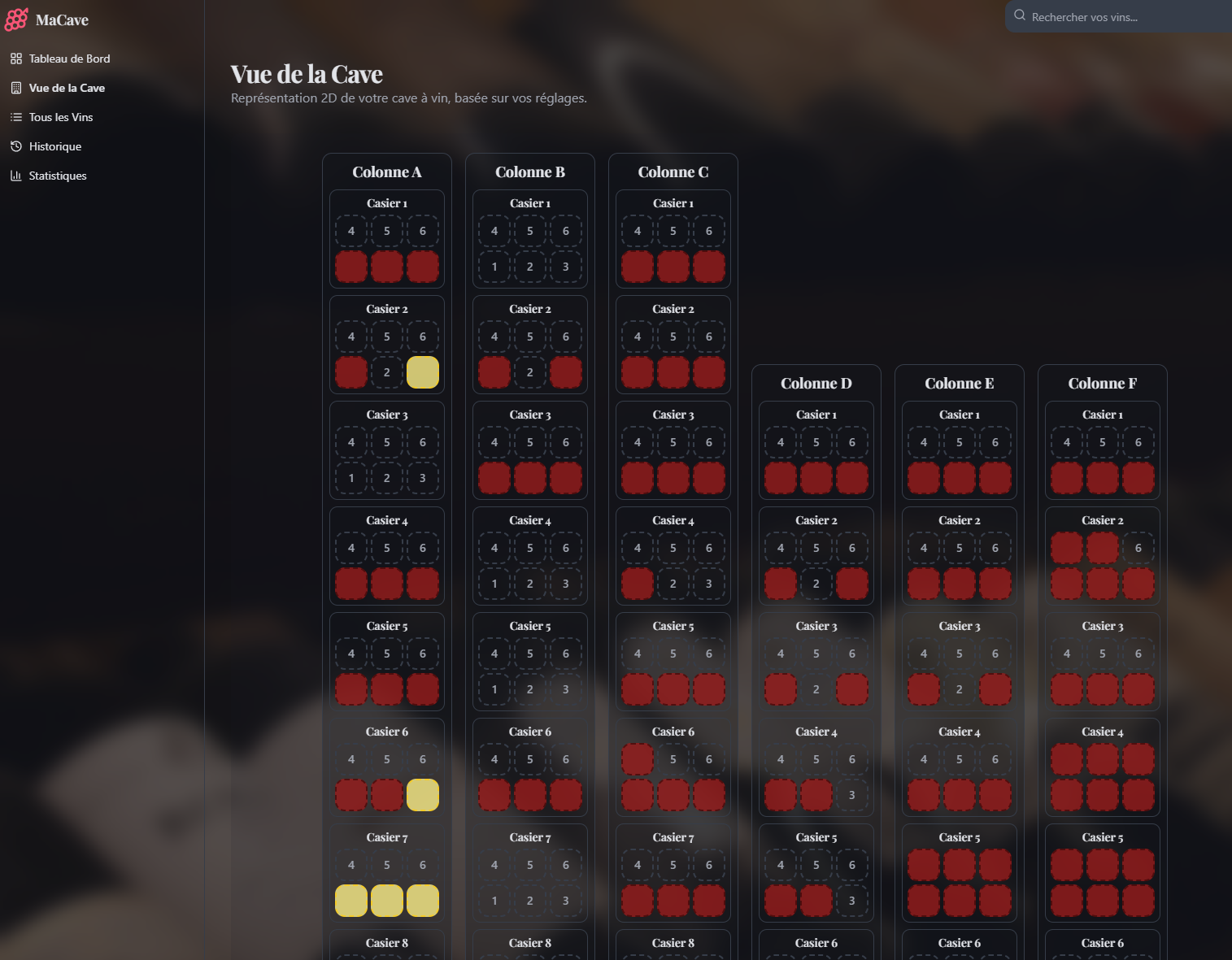 Vue 2D Interactive Visualisez votre cave telle qu’elle est. Configurez vos colonnes et casiers spéciaux (Ovale, Frigo) pour un repérage immédiat.